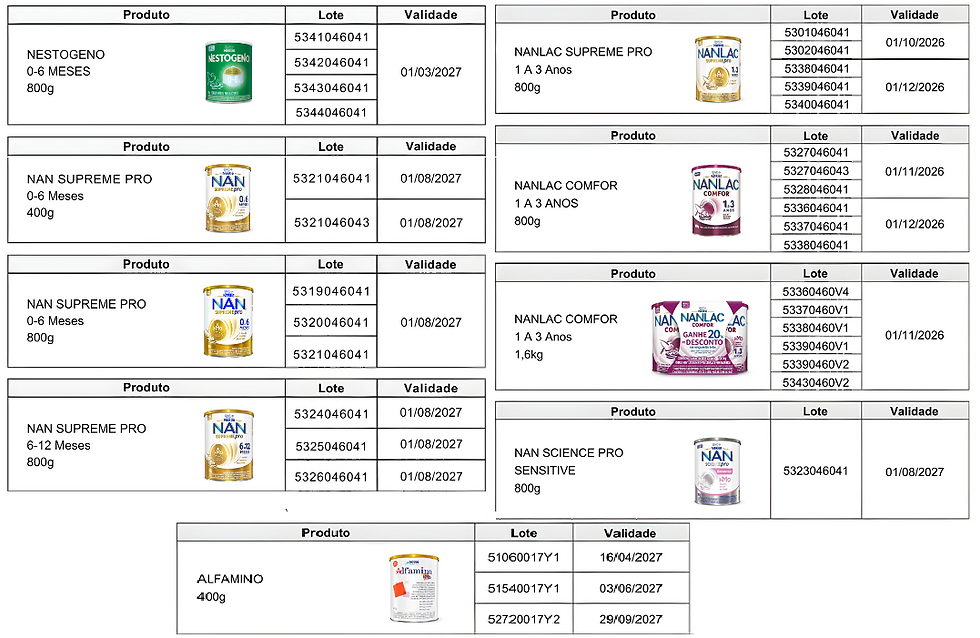 Esses lotes foram identificados por apresentarem concentrações de selênio e iodo superiores aos limites definidos pela legislação sanitária brasileira para fórmulas infantis destinadas a lactentes e crianças de primeira infância com necessidades dietoterápicas específicas.